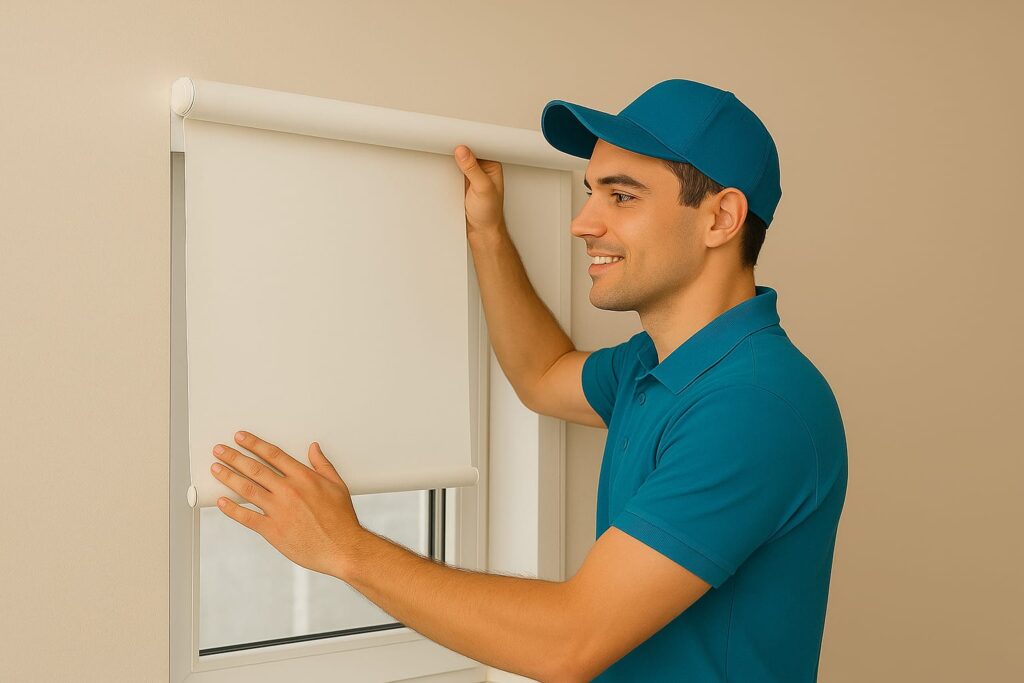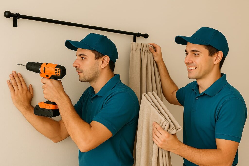 التركيب يشمل تثبيت القضبان والستائر بطريقة سلسة، مع ترتيب القطع بشكل مرتب لضمان حركة الستارة بسهولة والتحكم بالضوء بشكل مثالي، والمكان يظل مرتب ونظيف.