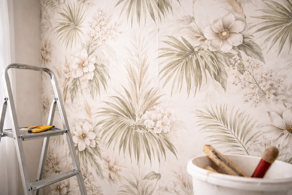 إضافة ورق الجدران على الحوائط تمنح المكان مظهرًا متجددًا خلال وقت قصير. يتم التنفيذ بدقة عالية لضمان تطابق النقوش وانسيابية الشكل العام. النتيجة تكون جدارًا متناسقًا وخاليًا من الفواصل الواضحة.